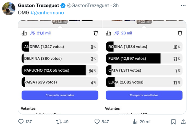Seguidamente, el ex Gran Hermano publicó sus resultados en Instagram también, donde mostró total sorpresa por la coincidencia con X, que no siempre suele darse: Furia y Papucho fueron nuevamente los más votados.