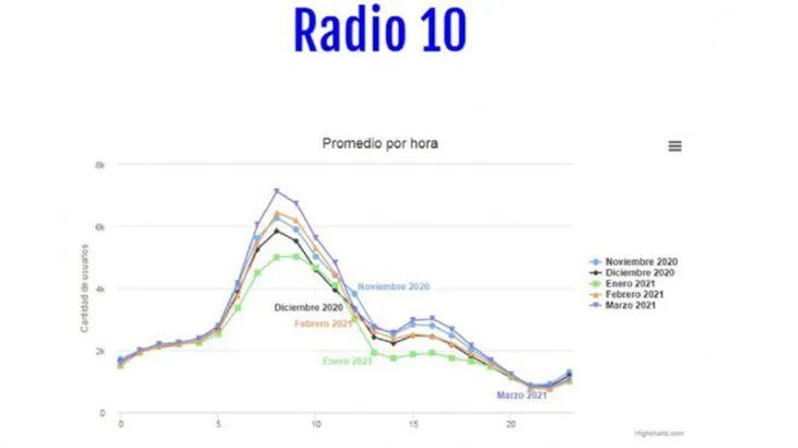 Otro dato significativo es el crecimiento constante en streaming, que contempla a la audiencia que escucha Radio 10 a través de páginas webs y de la App de la emisora, disponible para usuarios de Android y de IOS.