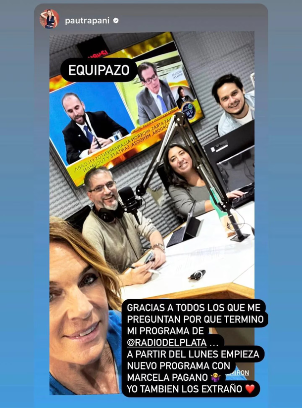 “Paula está dolida con Marcela por su actitud. Obviamente que su malestar más profundo es con las autoridades de la radio, el accionar de ellos dejó bastante que desear, no fueron buenas las formas”, dijo al respecto Juan Etchegoyen, quien habló con Trapani.