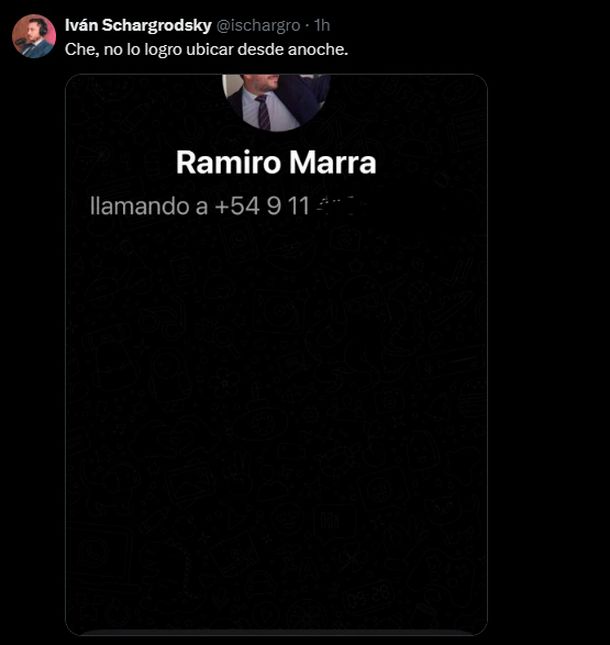 "Che, no lo logro ubicar desde anoche", escribió el periodista en su cuenta de X junto a una captura de teléfono en la que se ve el llamado.