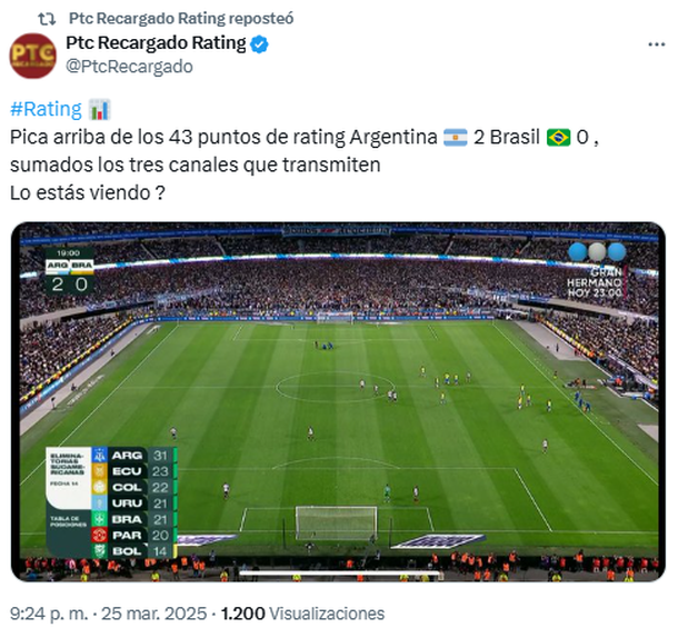 En este sentido, la pasión por los colores se trasladó también a la pantalla de Telefe, que es el canal que realizó la transmisión oficial del partido. El encuentro por las Eliminatorias está midiendo por encima de los 43 puntos de rating, siendo lo más visto de la jornada.