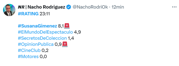 Por otro lado, Susana Giménez entrevistó de Nicolás Occhiato y Flor Jazmín Peña, quienes confirmaron su romance en enero en su programa “Nadie dice nada”. La nota promedió menos de 10 puntos de rating.