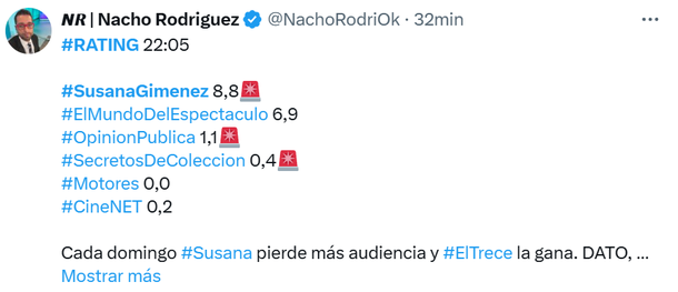 Con el correr de los minutos el programa de Susana Giménez subió en el rating pero ni un punto más y llegó a un pico de 9.5 lejos de los dos dígitos, esperando que Nathy Peluso le suba la audiencia.