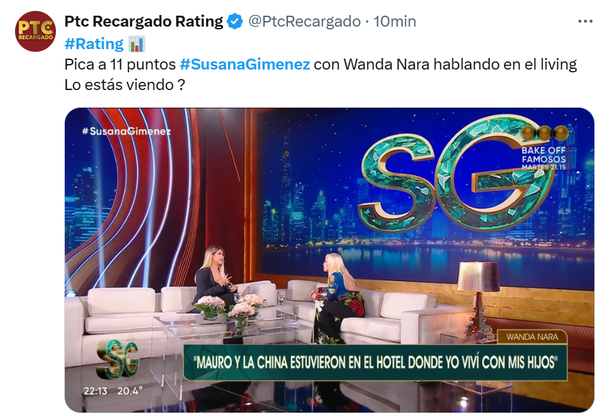 El pico de Susana Giménez fue de 13,4 puntos de rating, a partir de ahí empezó a bajar pero ubicándose toda la entrevista con Wanda en los dos dígitos.