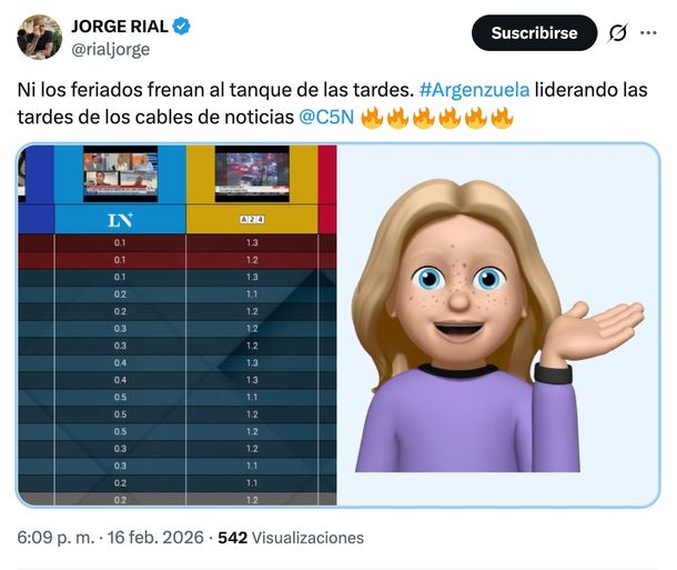 “Ni los feriados frenan al tanque de las tardes. #Argenzuela liderando las tardes de los cables de noticias @C5N”, posteó el periodista, acompañando sus palabras con los números que confirmaban la amplia ventaja.