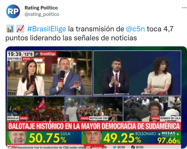 En Brasil, Luiz Inácio Lula da Silva se convirtió en el nuevo Presidente y en breve sucederá a Jair Bolsonaro, con una diferencia mínima. Y en la Argentina, la señal C5N cubrió la noticia y en este caso ganó ampliamente en el rating alcanzando picos de 6,5 de rating.