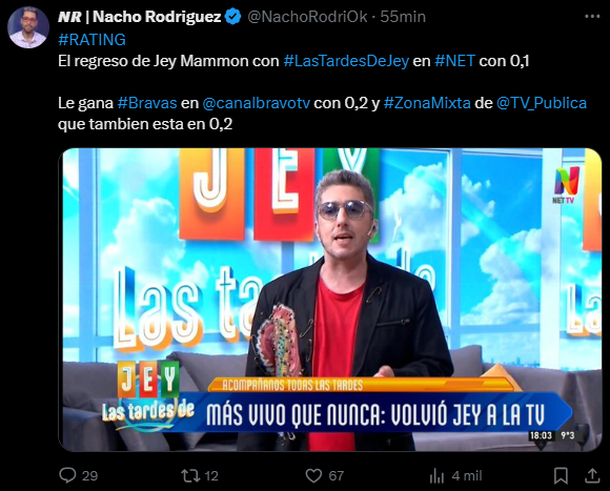 El ciclo llamado "Las tardes de Jey" comenzó este miércoles 10 de julio en Net TV y obtuvo un 0,1 en rating en su vuelta a la pantalla chica, siendo lo menos visto, dado que "Bravas" se impuso con 0,2 en Bravo TV y "Zona Mixta" igualó esa marca en la TV Pública.