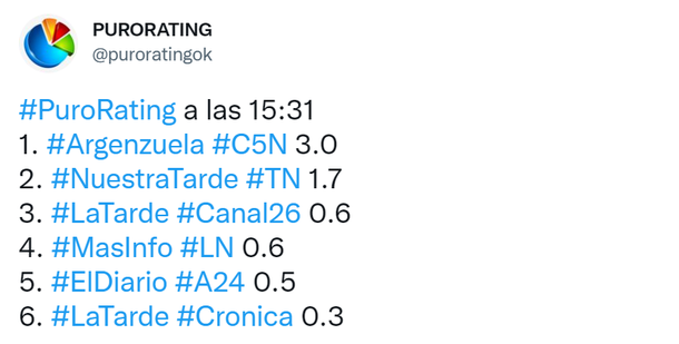 Luego de las 16 horas Argenzuela siguió liderando con comodidad, con picos de más de 3 puntos y así el tanque de la tarde de C5N mantiene su liderazgo.