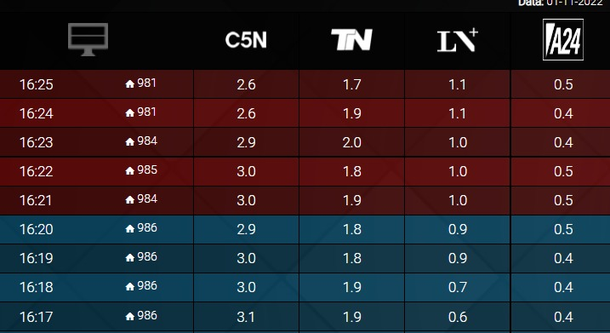 Y cuando las señales de noticias dejan de ser competencia para Rial, va por los canales de aire, ubicándose varias veces en el minuto a minuto en el tercer lugar, debajo de El Trece y arriba de América TV.