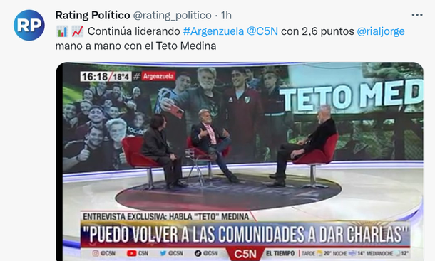 Argenzuela, el programa que conduce Jorge Rial por la señal de noticias C5N, tuvo este lunes 3 de octubre de 2022 a Marcelo Teto Medina y lideró el rating el segmento de la tarde entre las 15 y las 17 horas.
