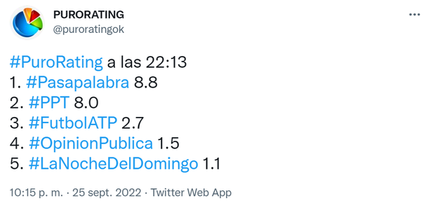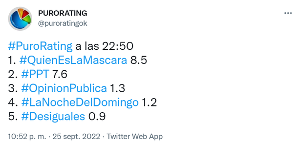 Este domingo 25 de septiembre la competencia tuvo números bajos, con ninguno de los tres programas que compiten por el podio, Periodismo Para Todos, Pasapalabra y Quién es la máscara, pudo tener picos de dos dígitos.