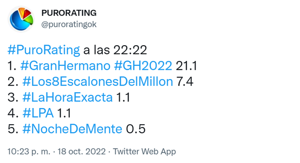 El primer día de Gran Hermano estalló con el rating, con picos de 23 puntos en su regreso a la pantalla de Telefe colmó las expectativas que estaban centradas en el reality. Y este martes 18 de octubre sigue por el mismo camino.