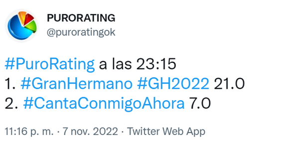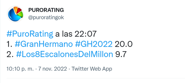 Y una vez que llegó a los 20 no bajó más, midiendo 22 puntos cuando comenzó Marcelo Tinelli con su programa de canto en El Trece.