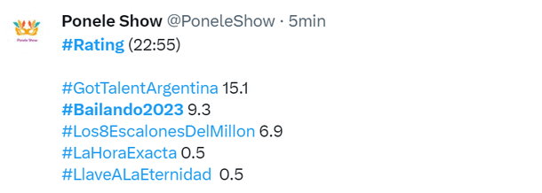 Sin la competencia fuerte de El Trece, el Bailando 2023 otra vez pasó los 10 puntos de rating y si bien no los pudo mantener, siempre estuvo cerca de las dos dígitos.