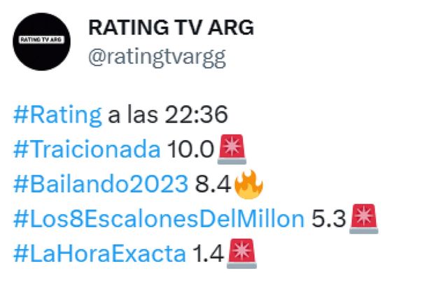 El Bailando, por su parte, se ubicaba segundo pasadas las 22.30, con 8.4, sacándole una ventaja de 3.1 puntos a Los 8 escalones del millón, ciclo que emite El Trece.