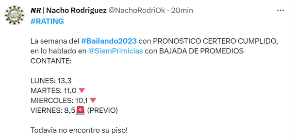El periodista de espectáculos Nacho Rodríguez calculó el promedio estimado de este viernes 8 de septiembre y esta vez el Bailando quedó en los 8 puntos de rating.