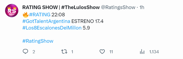 Go Talent Argentina estuvo cerca de los 20 puntos, algo que solo Gran Hermano logró con continuidad este año -y los partidos de fútbol importantes-, y cerró con un pico de rating de 19,7 puntos.