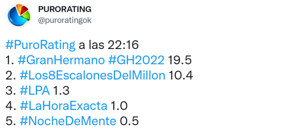 Luego cayó bastante Gran Hermano hasta llegar a los 16 puntos y Tinelli pasó por unas décimas los 8 puntos, haciendo más digno su rating aunque haya sudo duplicado por su rival.