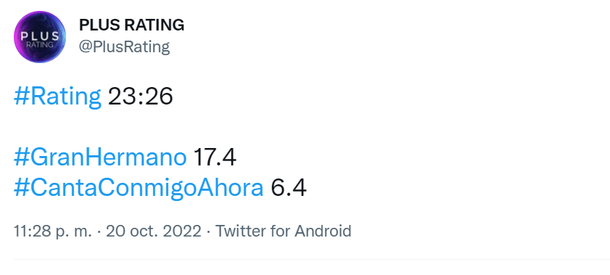 A las 22.50, ya con el programa de Marcelo Tinelli al aire, Canta conmigo ahora, El Trece cayó a los 6 puntos y Gran Hermano se mantuvo dentro de los 21.4.