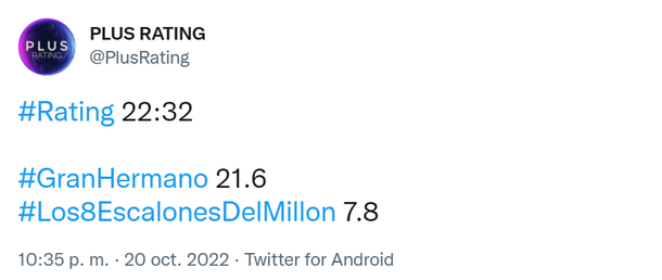 Antes de las 22.30 Gran Hermano llegó a los 20 puntos de rating y a luego de las 22.30 superó los 20 puntos, cayendo a los 7 puntos el programa de Guido.