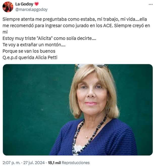 También la reconocida locutora Marcela Godoy se refirió a la partida de Petti: "Siempre atenta me preguntaba cómo estaba, mi trabajo, mi vida... ella me recomendó para ingresar como jurado en los ACE. Siempre creyó en mí. Estoy muy triste "Alicita" como solía decirte... Te voy a extrañar un montón", comenzó escribiendo, tras lo cual agregó: "¿Por qué se van los buenos?".