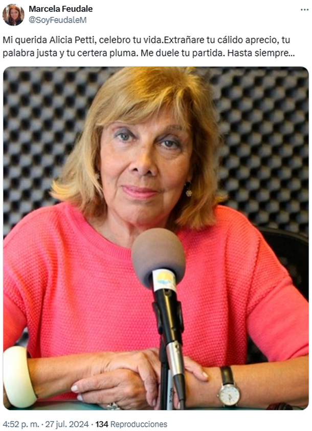 Por su parte, la locutora Marcela Feudale también dejó su mensaje en su cuenta de X: "Mi querida Alicia Petti, celebro tu vida. Extrañaré tu cálido aprecio, tu palabra justa y tu certera pluma. Me duele tu partida. Hasta siempre…", manifestó con dolor.