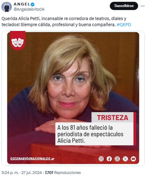 Uno de los que se refirió a la muerte de su colega fue Ángel de Brito, quien no dudó en elogiar su labor: "Querida Alicia Petti, incansable recorredora de teatros, diales y teclados. Siempre cálida, profesional y buena compañera", escribió el conductor de LAM.