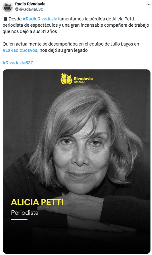 En tanto, Radio Rivadavia señaló: "Lamentamos la pérdida de Alicia Petti, periodista de espectáculos y una gran incansable compañera de trabajo que nos dejó a sus 81 años. Quien actualmente se desempeñaba en el equipo de Julio Lagos en #LaRadioSosVos, nos dejó su gran legado".