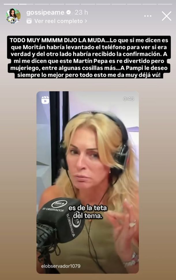 Pochi de Gossipeame reveló, en su cuenta de Instagram, cómo se tomó la noticia del romance de Pampita y la impulsiva reacción del empresario. Según la periodista, “Moritan habría levantado el teléfono para verificar si era verdad y del otro lado habría recibido la confirmación”.