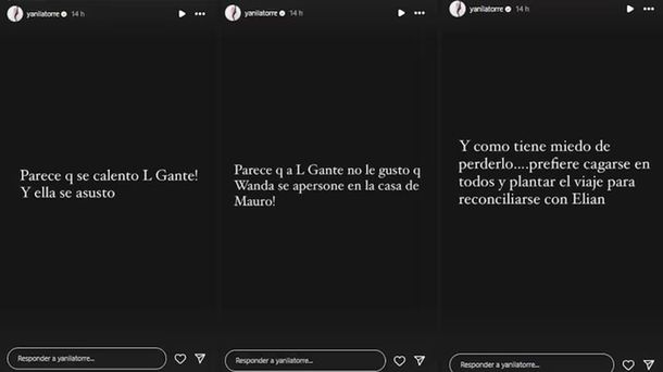 La conductora y panelista, compartió su versión sobre la reciente decisión de Nara de suspender un viaje y escribió en una imagen con fondo negro "Parece que se calentó L-Gante y ella se asustó, a él no le gustó nada que ella se apersone en la casa de Mauro" y sumó: "Y como ella tiene miedo de perderlo, prefiere dejar todo de lado y cancelar el viaje para reconciliarse con Elián".