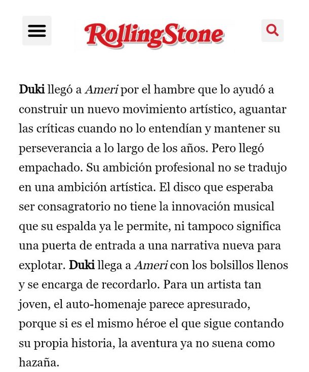 En su revista, y sin ningún tapujo, la crítica comienza: "Duki llegó a Ameri por el hambre que lo ayudó a construir un nuevo movimiento artístico, aguantar las críticas cuando no lo entendían y mantener su perseverancia a lo largo de los años".