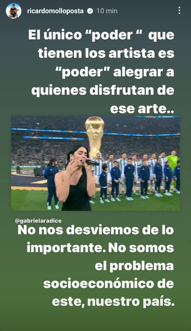 Luego, agregó: "No nos desviemos de lo importante. No somos el problema socioeconómico de este, nuestro país". Hay que destacar que la fotografía que compartió Mollo fue publicada por la periodista Gabriela Radice quien, a través de su perfil oficial, también defendió a Lali por los constantes ataques que recibe desde la asunción de Milei.