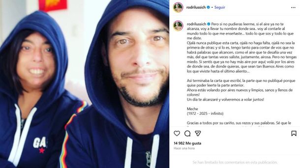 El conductor expresó su conmoción con un texto cargado de dolor: "No lo puedo creer. Nuestra Meche acaba de fallecer, y no encuentro explicación a semejante injusticia de la vida. Una luchadora de siempre, una persona talentosa, buena, cariñosa y por sobretodo amiga de sus amigos, hija amorosa y hermana compañera", inició junto a una foto junto a ella.