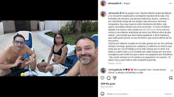 Más adelante, Pallares recordó la última vez que compartieron una comida los tres: "Soy muy torpe en estos momentos de dolor, solo quiero recordarla siempre así como en la foto. O como el último sábado a la noche y esa comida con Rodrigo Lussich en la cual nos reímos y recordamos anécdotas de estos tres últimos años de gira teatral, una comida que duró hasta pasada las 3 de la mañana y que nadie pudo pensar en ese momento, que sería la última de los tres juntos".