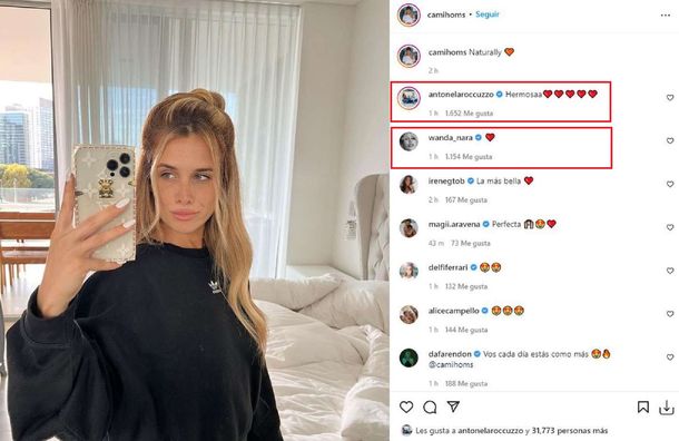 “Hermosa”, le escribió la esposa de Lio Messi junto a muchos corazones, mismo emoji que eligió la Wanda Nara para marcar su presencia. Entre los miles de likes y comentarios también se destacó el de Magalí Aravena, ex esposa del Toto Salvio. “Perfecta”, le escribió.