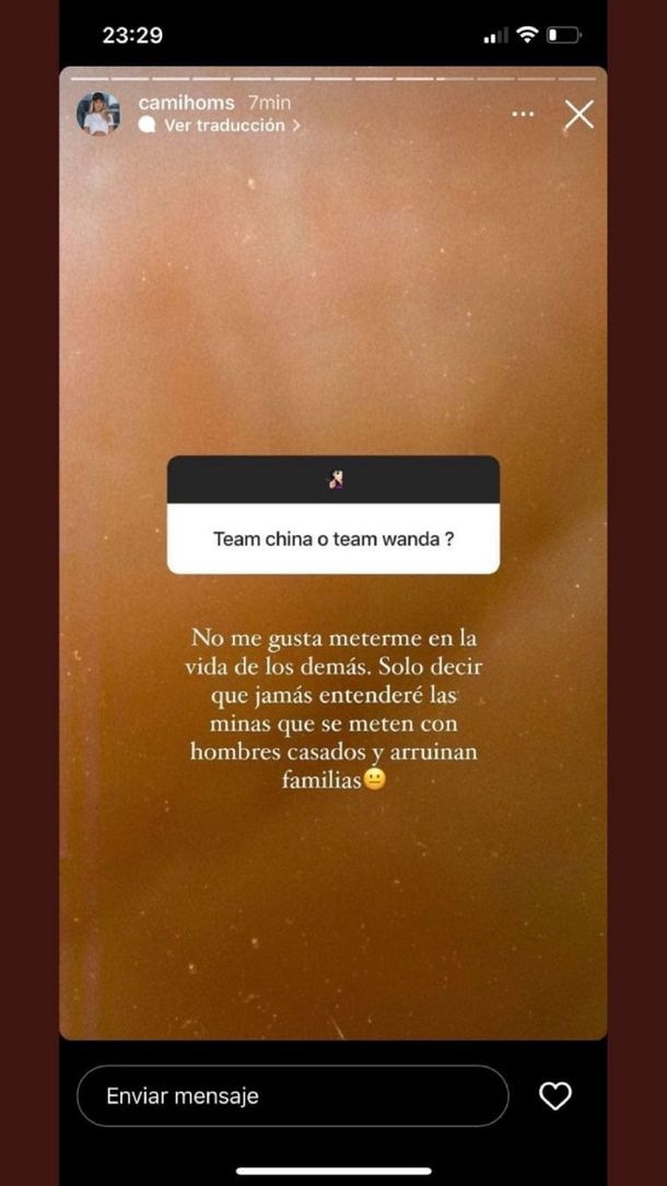 Días atrás, Camila contestó una pregunta sobre el Wandagate y dijo: “No me gusta meterme en la vida de los demás. Solo decir que jamás entenderé a las minas que se meten con hombres casados y arruinan familias”.