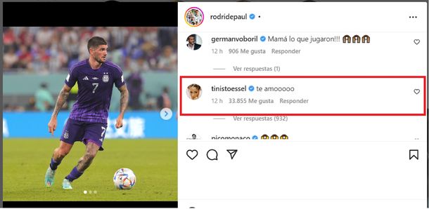 Tras el contundente triunfo de la Scaloneta por 2 a 0 ante Polonia, Rodrigo de Paul se mostró feliz de haber conseguido el pase a los octavos de final, y en su cuenta de Instagram escribió: “Soñemos. Octavos de final, ¡allá vamos! Vamos Selección”. El mensaje cosechó miles de corazones y mensajes, pero el más importante fue el de su novia que le dedicó un "Te amooo"