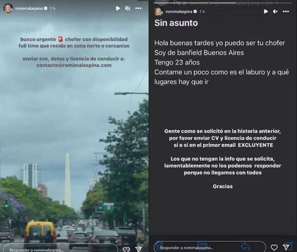 De inmediato, Romina Malaspina mostró la primera solicitud para aplicar a la oferta laboral. “Hola buenas tardes, yo puedo ser tu chofer. Soy de Banfield, Buenos Aires. Tengo 23 años. Contame un poco cómo es el laburo y a qué lugares hay que ir”, había escrito un joven.