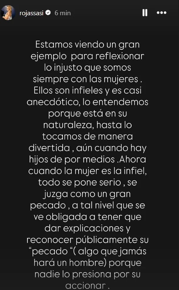 Finalmente, Rojas profundizó sobre las consecuencias que enfrentan las mujeres cuando cometen infidelidad, en contraste con la relativa impunidad que reciben los hombres: "Ahora cuando la mujer es la infiel, todo se pone serio, se juzga como un gran pecado, a tal nivel que se ve obligada a tener que dar explicaciones y reconocer públicamente su 'pecado' (algo que jamás hará un hombre) porque nadie lo presiona por su accionar", concluyó, poniendo el foco en la presión social y mediática que recae sobre ellas, mientras los hombres rara vez enfrentan cuestionamientos equivalentes.