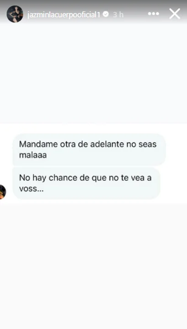 Lejos de quedarse en un simple halago, la conversación continuó subiendo de tono. Jazmín le confirmó un encuentro anterior: “Sí, el año pasado nos vimos. Te paso mi (...)”, lo que dio lugar a una nueva respuesta por parte del deportista: “Mandame otra de adelante, no seas mala. No hay chance de que no te vea a vos”.