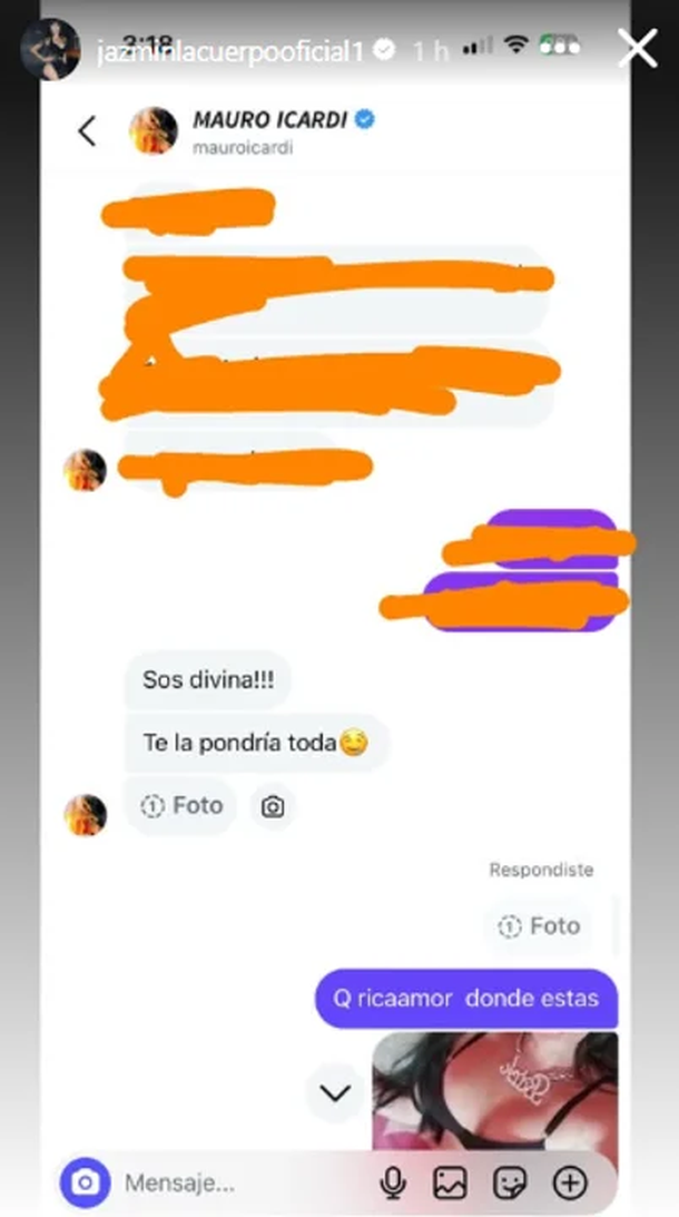 Horas antes, algunas capturas ya habían circulado y provocado revuelo. Sin embargo, en esta nueva entrega, la influencer fue más allá. Durante una transmisión en vivo, mostró cómo Icardi reaccionaba a sus imágenes con comentarios sugerentes y una evidente intención de avanzar en el intercambio. Según la secuencia de chats, luego de que Jazmín le enviara una imagen en ropa interior, el futbolista respondió: “Estás muy fuerte. Sabelo. Anduviste con -tapó el nombre-, me dijo que se vieron en Libertador. Hacés encuentro”.