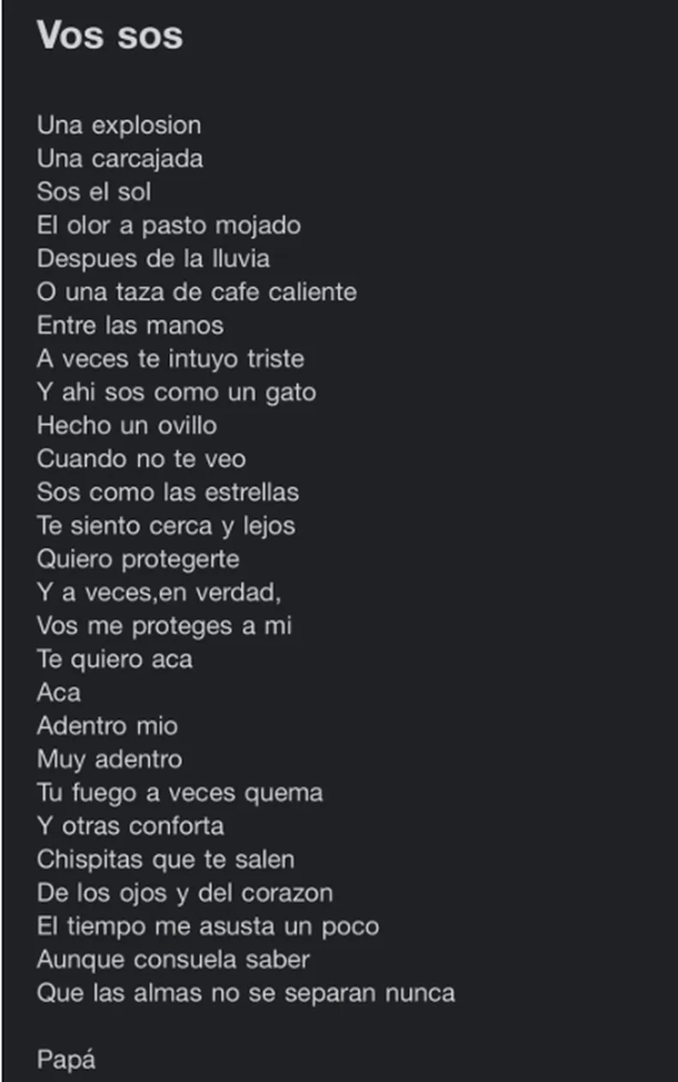 Sin embargo, esta pieza literaria permitió ver un costado mucho menos expuesto: el de un padre que sentía miedo por el paso del tiempo, que encontraba consuelo en el vínculo con su hija y que apostaba, desde la palabra escrita, a una conexión eterna.