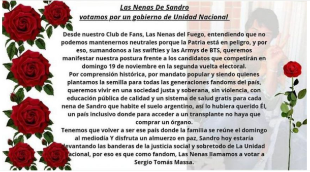 "Desde nuestro Club de Fans, Las Nenas del Fuego, entendiendo que no podemos mantenernos neutrales porque la Patria está en peligro, y por eso, sumandonos a las swifties y las Armys de BTS, queremos manifestar nuestra postura frente a los candidatos que competirán en domingo 19 de noviembre en la segunda vuelta electoral" comenzaron.