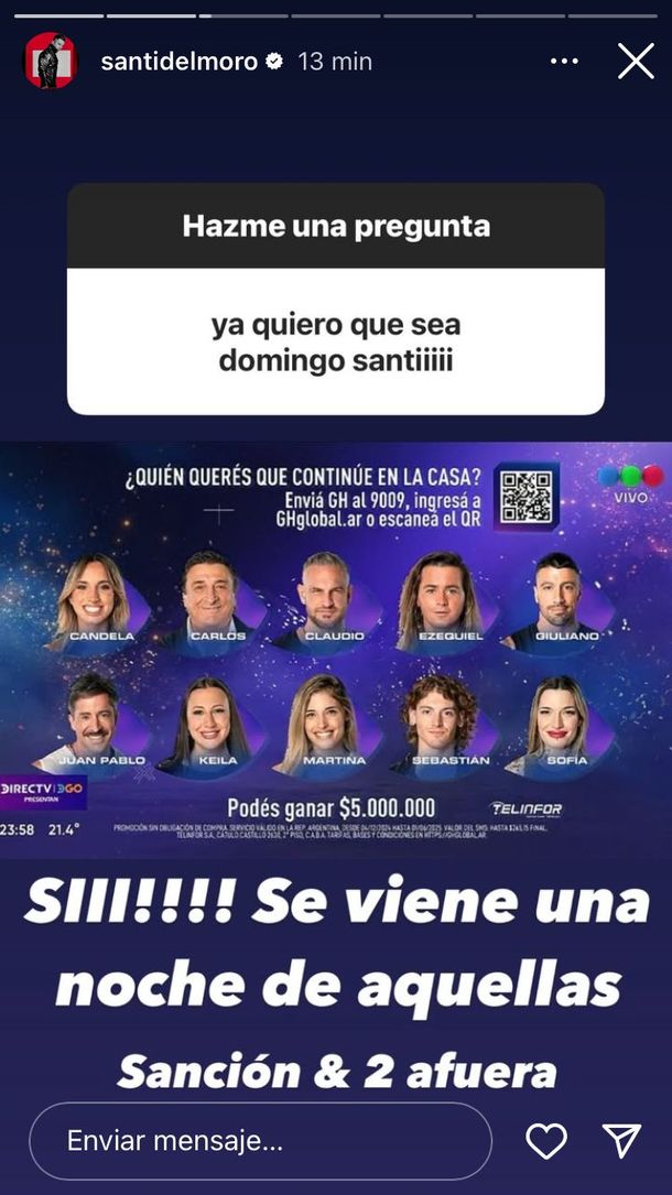 El conductor del reality abrió la posibilidad a que sus seguidores le hagan consultas, con la famosa cajita de preguntas de Instagram. En este sentido, un fan escribió: "Ya quiero que sea domingo, Santiiii". Ante esto, Del Moro fue categórico: "¡Síiii! Se viene una noche de aquellas. Sanción y 2 afuera".