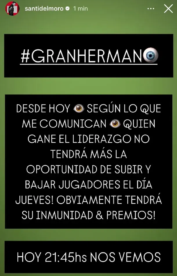 Fue el propio conductor del ciclo, Santiago del Moro, quien se encargó de comunicar la noticia a través de sus historias de Instagram. "Desde hoy, según lo que me comunican, ¡quien gane el liderazgo no tendrá más la oportunidad de subir y bajar jugadores el día jueves!", expresó el presentador. De esta manera, la placa de nominados quedará conformada cada miércoles tras las nominaciones, sin la posibilidad de modificaciones.