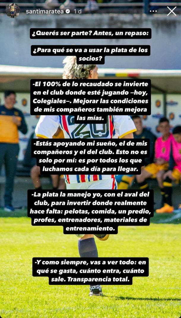 “Habilitamos el sistema de socios. Ya podés sumarte”, anunció con entusiasmo. Inmediatamente después, explicó el destino de los aportes: “El 100% de lo recaudado se invierte en el club donde esté jugando – hoy, Colegiales –. Mejorar las condiciones de mis compañeros también mejora las mías”.