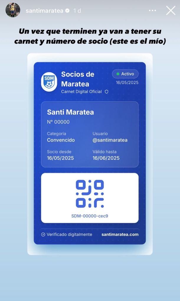 Una vez realizado el pago mediante Mercado Pago, los usuarios son redirigidos a la página oficial de Socios de Maratea, donde podrán crear su perfil personalizado y obtener su carnet digital. Para cerrar el anuncio, Maratea difundió los enlaces para registrarse en ambas categorías y mostró cómo lucen los carnets, sellando así el lanzamiento de su ambicioso e innovador proyecto personal.