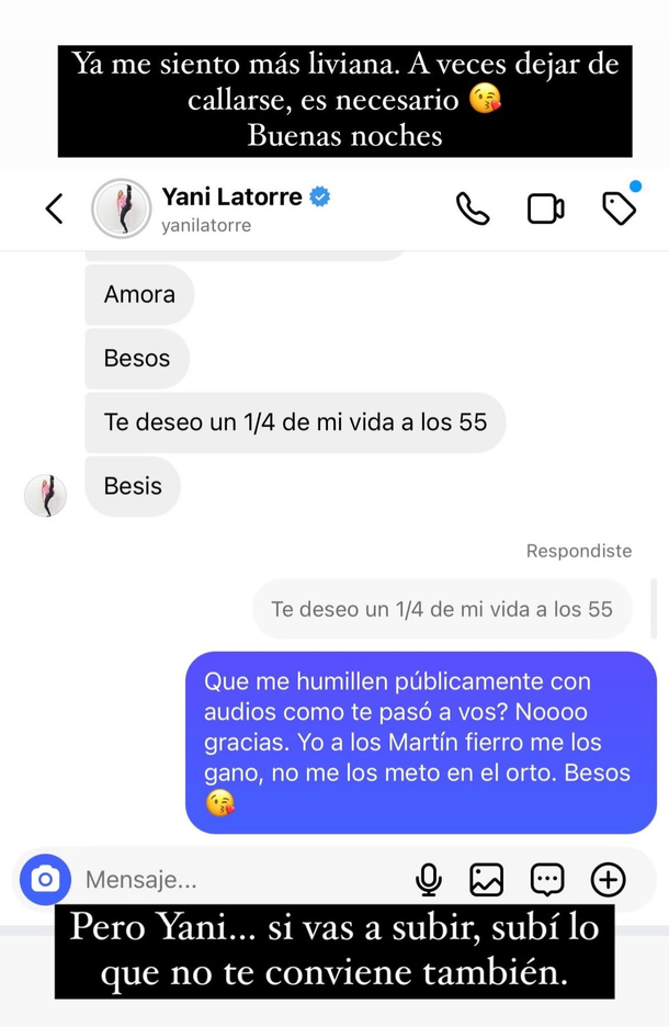 Ante esto, la pareja de Mauro Icardi compartió en sus historias de Instagram una captura de una parte del chat con Yanina y expresó: "Ya me siento más liviana. A veces dejar de callarse, es necesario". Y agregó: "Pero Yani... si vas a subir, subí lo que no te conviene también".