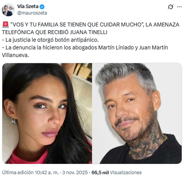 Este lunes, el periodista Mauro Szeta compartió en sus redes sociales el tenor de la amenaza que habría recibido la hija de Marcelo Tinelli y Paula Robles. La frase que publicó Szeta en su cuenta de X fue: “Vos y tu familia se tienen que cuidar mucho”. El periodista señaló que esta era “La amenaza telefónica que recibió Juana Tinelli”.