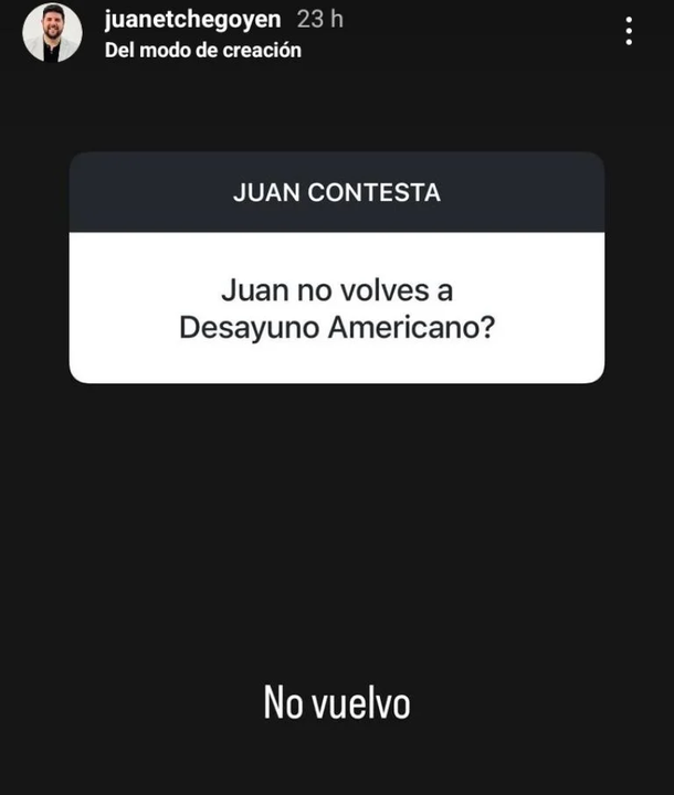 Si bien en su momento se especuló con un regreso tras la recuperación, en las últimas horas Etchegoyen disipó toda duda. A través de la clásica cajita de preguntas de Instagram, un seguidor le consultó por su vuelta al ciclo, y él respondió de manera tajante: “No vuelvo”.